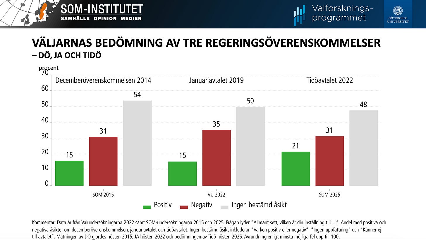 I den tredje fasen, där M, KD och L har befunnit sig, kan man förvisso förhandla med SD och till och med regera med stöd av dem. Men relationen måste fortfarande regleras. Just därför blev Tidöavtalet nödvändigt: som ett sätt att möjliggöra samarbete utan full inkorporering. SD kunde bära upp regeringsmakten, men inte fullt ut träda in i regeringen.